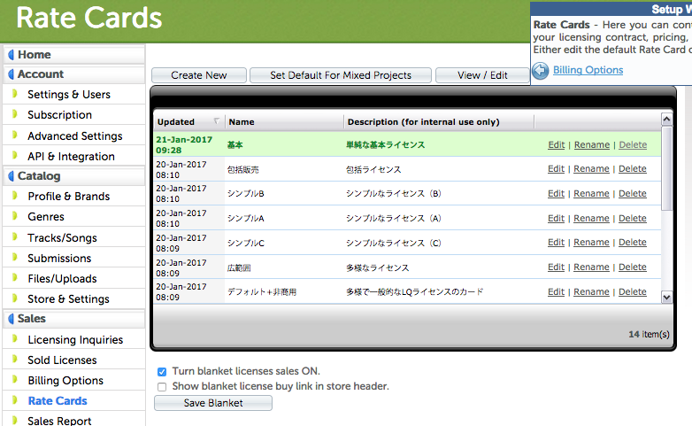 Set Default For Mixed Projects: 特定の価格表を選択した状態でクリックすることで、その価格表を1つのプロジェクトで複数の曲をライセンスしたい場合のデフォルトの価格表に指定できます。